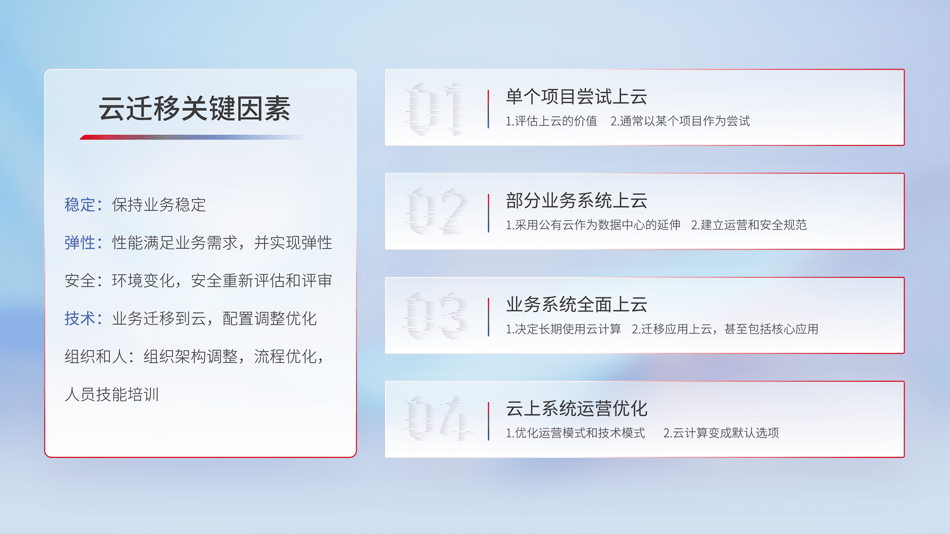 结合实际业务,,,,从规划设计、、云平台选型、、云原生改造、、、、数据迁移、、、集成交付,,迁移全过程为客户识别最佳上云路径,,做好风险识别管理,,设计网络架构、、身份权限、、、、安全审计合规、、操作审计、、、、日志审计、、监控告警策略、、多站点容灾设计等,,对云上基础设施进行整体规划,,,提升IT治理水平,,,以满足弹性、、、、高可用、、、高性能的需求。。。。