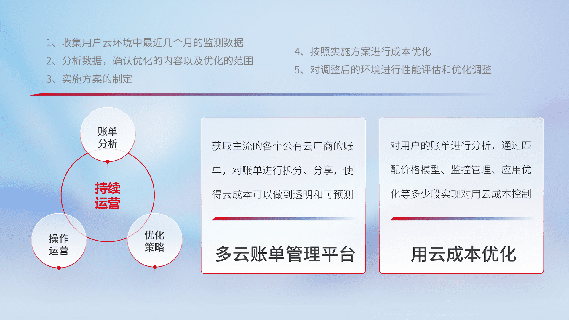 通过多云纳管,,,以统一的资源数据模型把客户的云资源进行抽象和封装,,进而实现对多云资源的统一操作,,,,保障云资源管理的可靠性、、稳定性与可用性。。。量身定制化运维内容,,,配置、、开发运维、、补丁管理、、、备份、、监控、、认证和访问管理、、、、审计和日常巡检等,,保障在用云过程中的可靠度,,稳定度以及高可用率。。